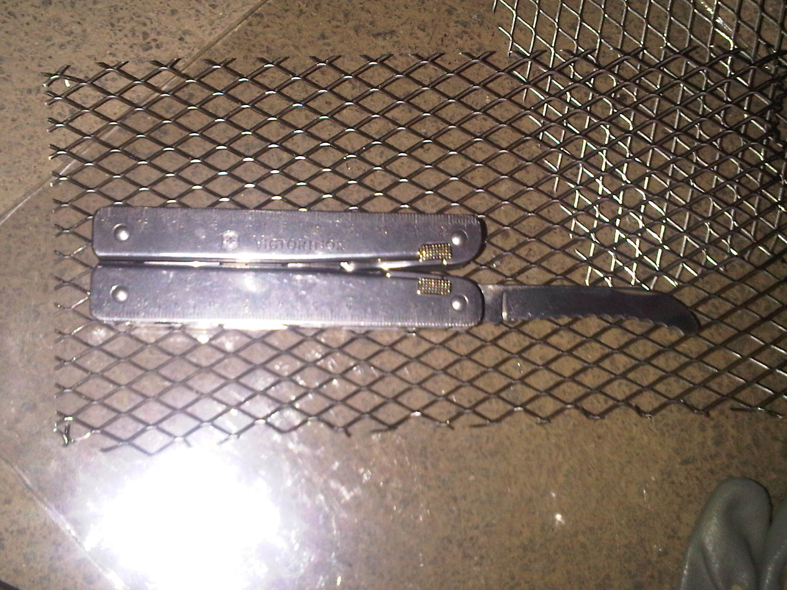 Con la ayuda de mi multiherramienta Vitorinox y su útil de corte de metal (no me preguntéis como pero funciona muy bien, corta el alambre con relativa facilidad. Se corta la pieza a medida del hueco.