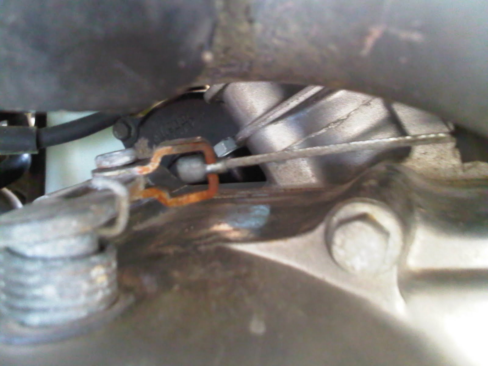 Para la reparación, mi mecánico Juanito de Torrellano, ha intentado un nuevo sistema que básicamente consiste en colocar el cable al revés de la posición correcta. Es decir, la parte que va en la maneta abajo, y la presilla en la maneta.