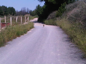 Cuando ya parecía que solo me cruzaría con liebres, conejos, perdices y ciclistas, me ha hechado el alto una Beagle de mirada aviesa. Nos hemos quedado ambos estudiando nuestras posibilidades (os juro que ni a "pestañeao" la cabrona). De repente aparece de la nada (literalmente, ya que cuando he pasado junto al lugar, no he podido descubrir de donde ha podido salir el "asomo" de hombre) un ser humano (al menos tenía toda la pinta) y la perra comienza a andar hacia mi con su amo al rebufo, al llegar a mi altura ambos me escanean de arriba a bajo y continúan sin decir palabra y sin mirar atrás. Ha sido inquietante, pero la Beagle era preciosa.